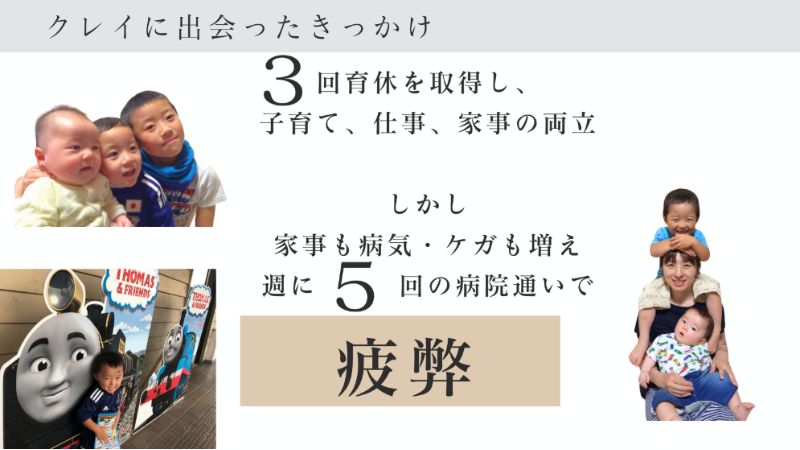 新井さんがクレイと出会ったのは、第3子出産後のこと。当時は3人の育児に加え、度重なる病気やけがによる通院で毎日帰りが遅く、疲弊するだけの日々を送っていたそうです。