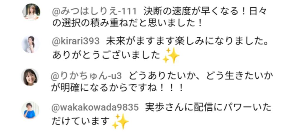 「皆さんも決断の速度が上がったり迷いが無くなったりしてきたら、大きな変化が起きるサインです」とおっしゃっていた実歩さん。